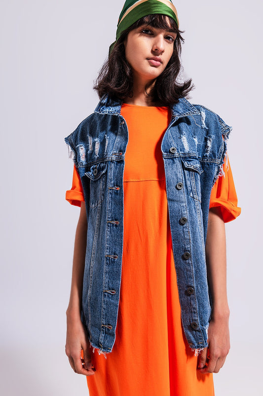 Gilet taglio lungo in denim blu medio con fondo sfrangiato