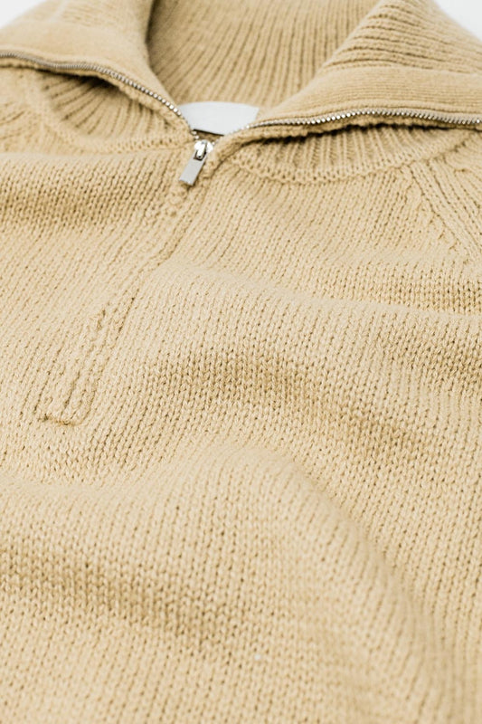 Maglione dolcevita beige senza maniche con chiusura a zip