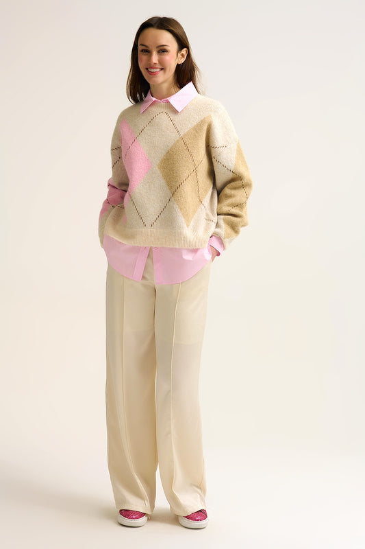 Maglione in maglia rombi color crema con blocchi di colore a contrasto rosa e cammello