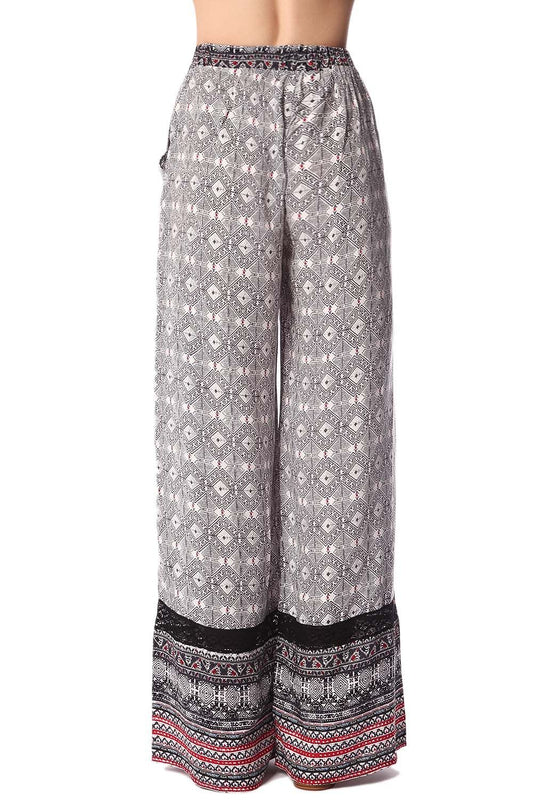 Pantaloni con fondo ampio nero con stampa etnica e inserto in pizzo