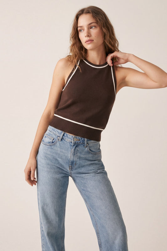 Top senza maniche in maglia marrone con dettaglio di righe bianche