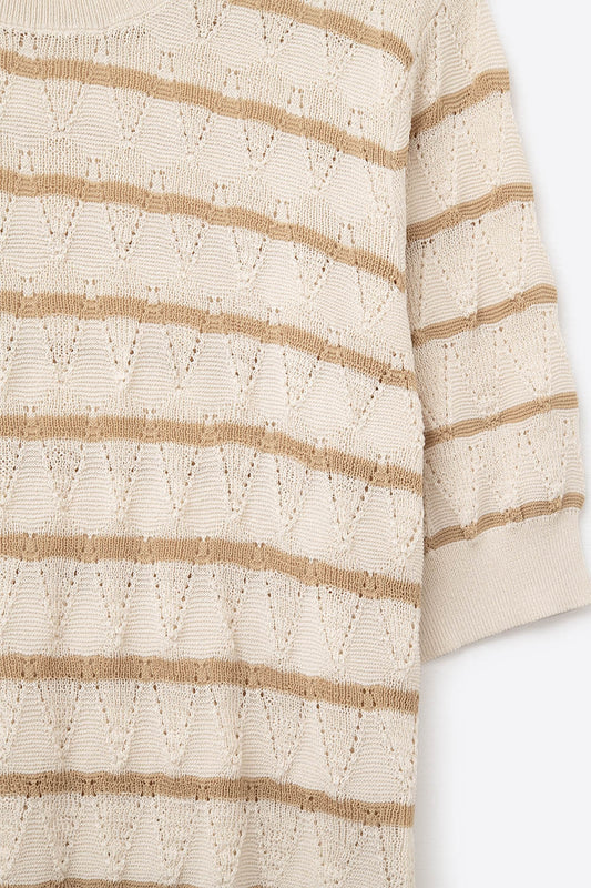 Top in maglia traforata cammello con maniche corte e strisce bianche