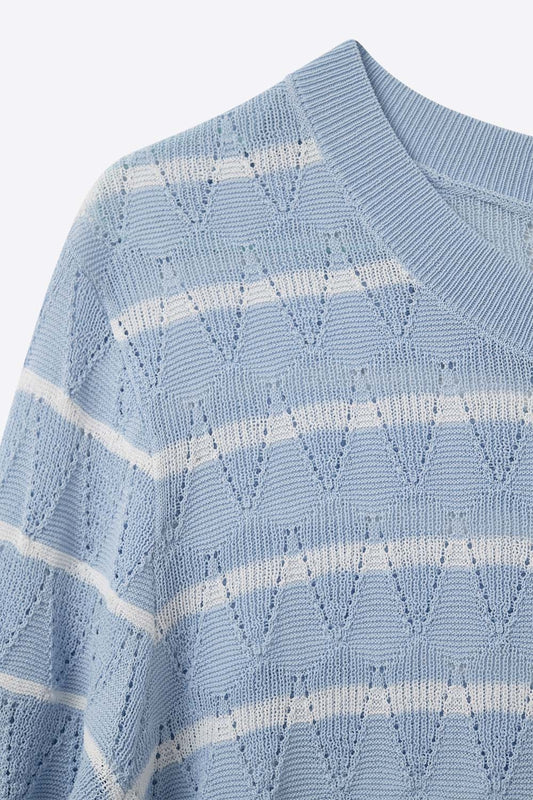 Top in maglia traforata blu cielo con maniche corte e righe bianche