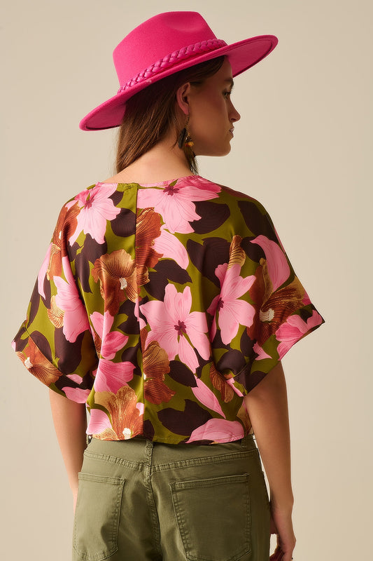 Top con nodo floreale e sfondo verde in tessuto di raso