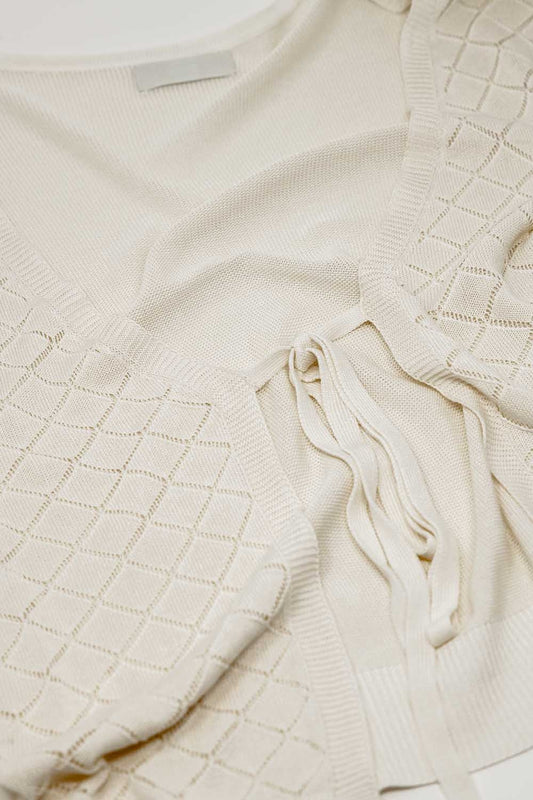 Maglione senza maniche colore beige con scollo a giro e dettaglio a treccia sulla scollatura