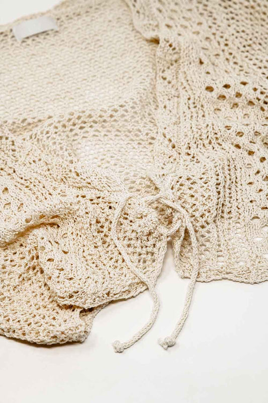 Cardigan cropped in beige con chiusura a cravatta