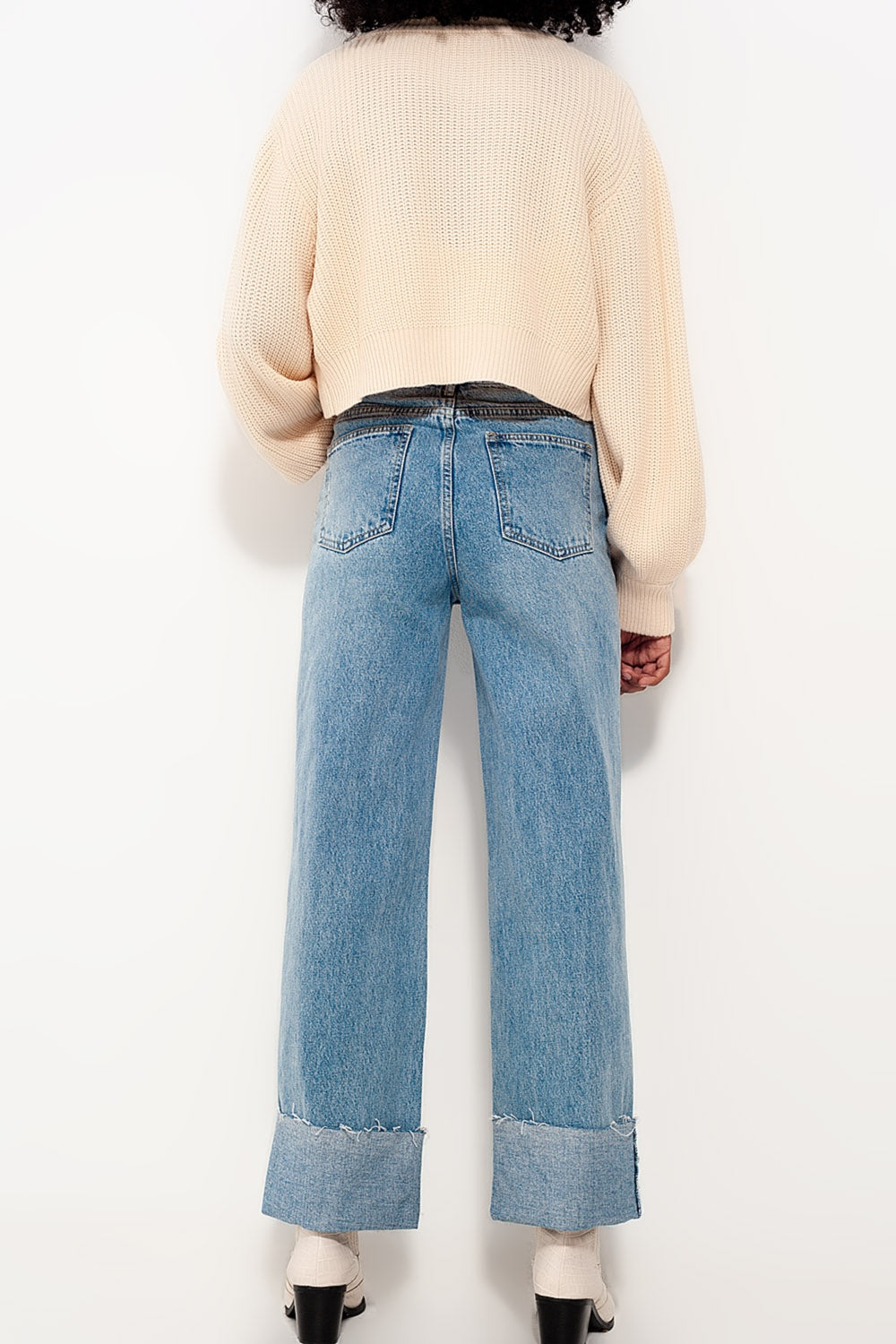 Jeans dritti comodi lavaggio candeggiato con risvolti