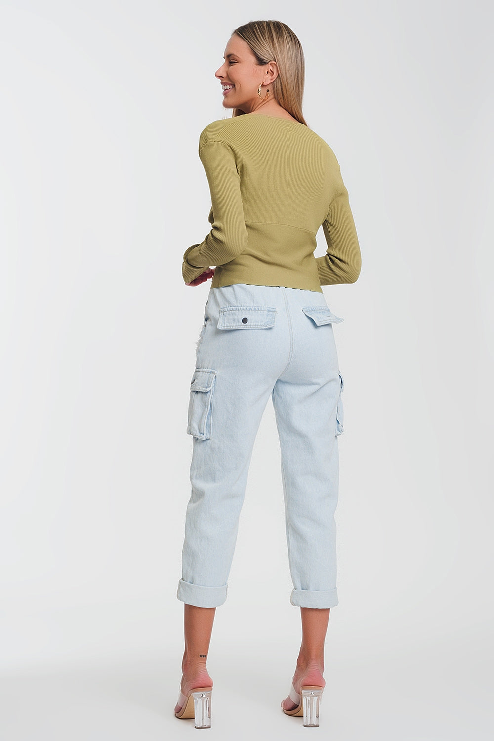 Maglione verde a coste con scollo a V
