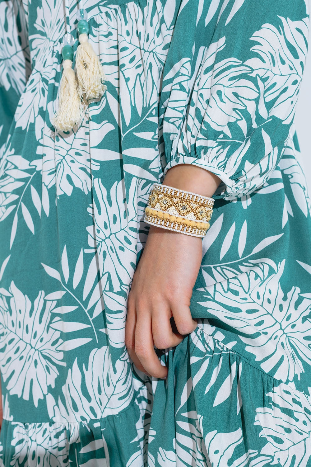 Maxi abito boho con maniche a palloncino e stampa a foglie in verde