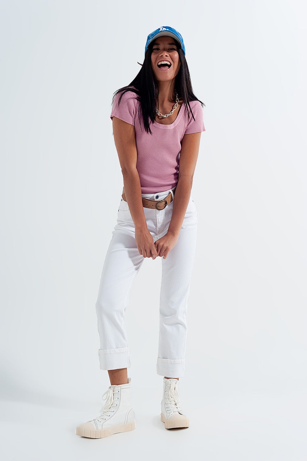 T shirt girocollo attillata lavorata a coste rosa