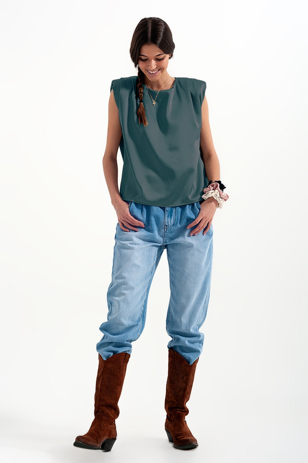 Top senza maniche raccolto in vita in raso verde con spalline imbottite