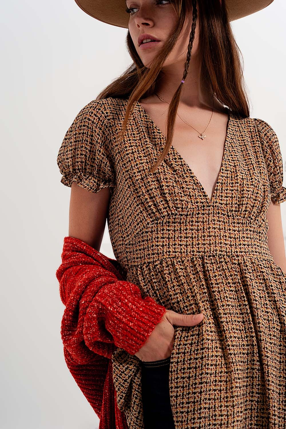 Vestito grembiule corto crema a quadri