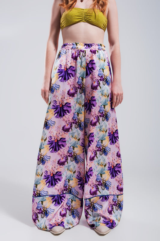 Pantaloni a fondo ampio a vita alta in raso a fiori viola