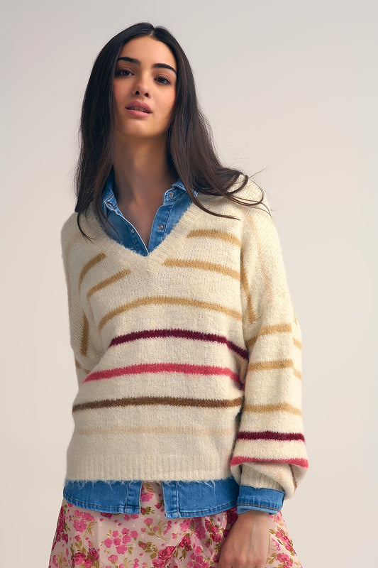 Maglione oversize color crema con riga multicolore