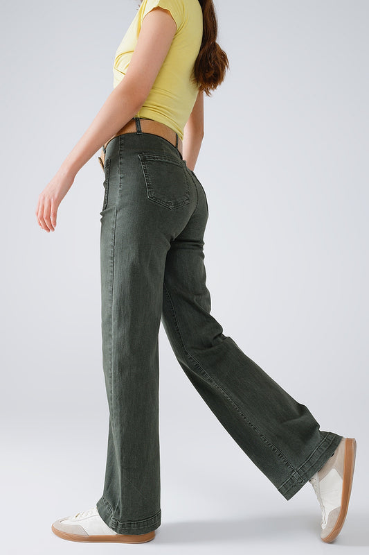 jeans flare a vita alta con tasche frontali in kaki scuro