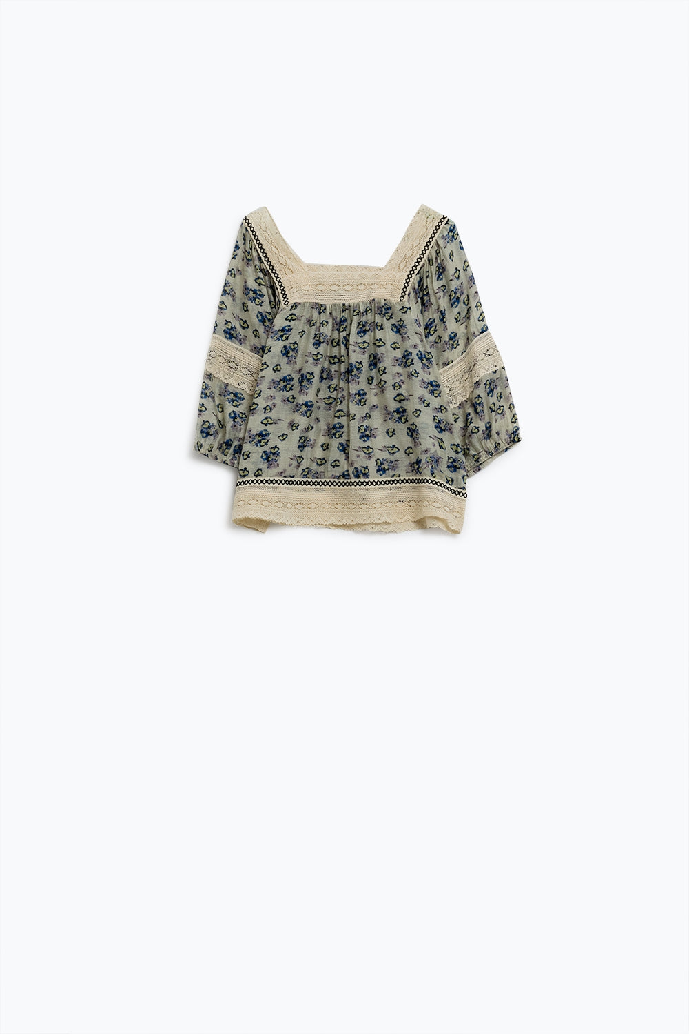 Sotto Categoria: Top. Collo: Scollo quadrato. Manica: Maniche a tre quarti. Stampa: Motivo floreale. Modello: Vestibilità comoda. stile: Modello Romantico. Tessuto: Chiffon. Dettagli del prodotto: In pizzo a fiori. runs true to size. S.
