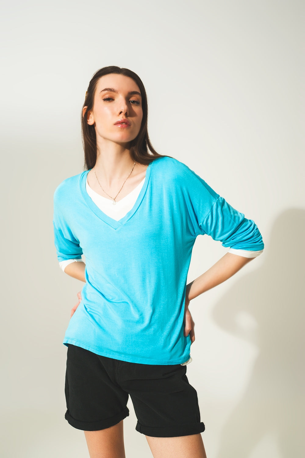 Top con scollo a V in morbidissimo cotone e modal azzurro