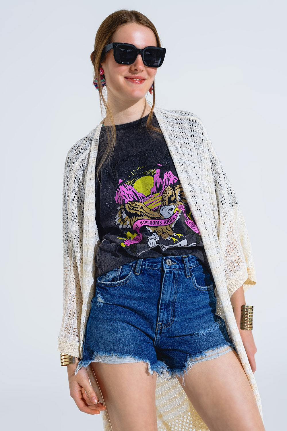 Cardigan crema in stile bohémien con maglia a righe e frange