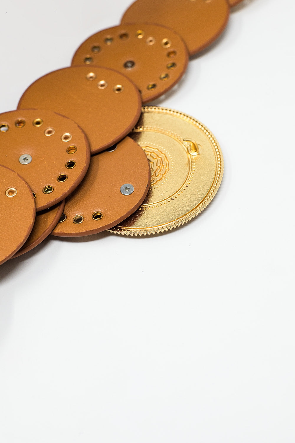 Cintura in pelle marrone con fibbia rotonda in strass oro e dettagli dorati