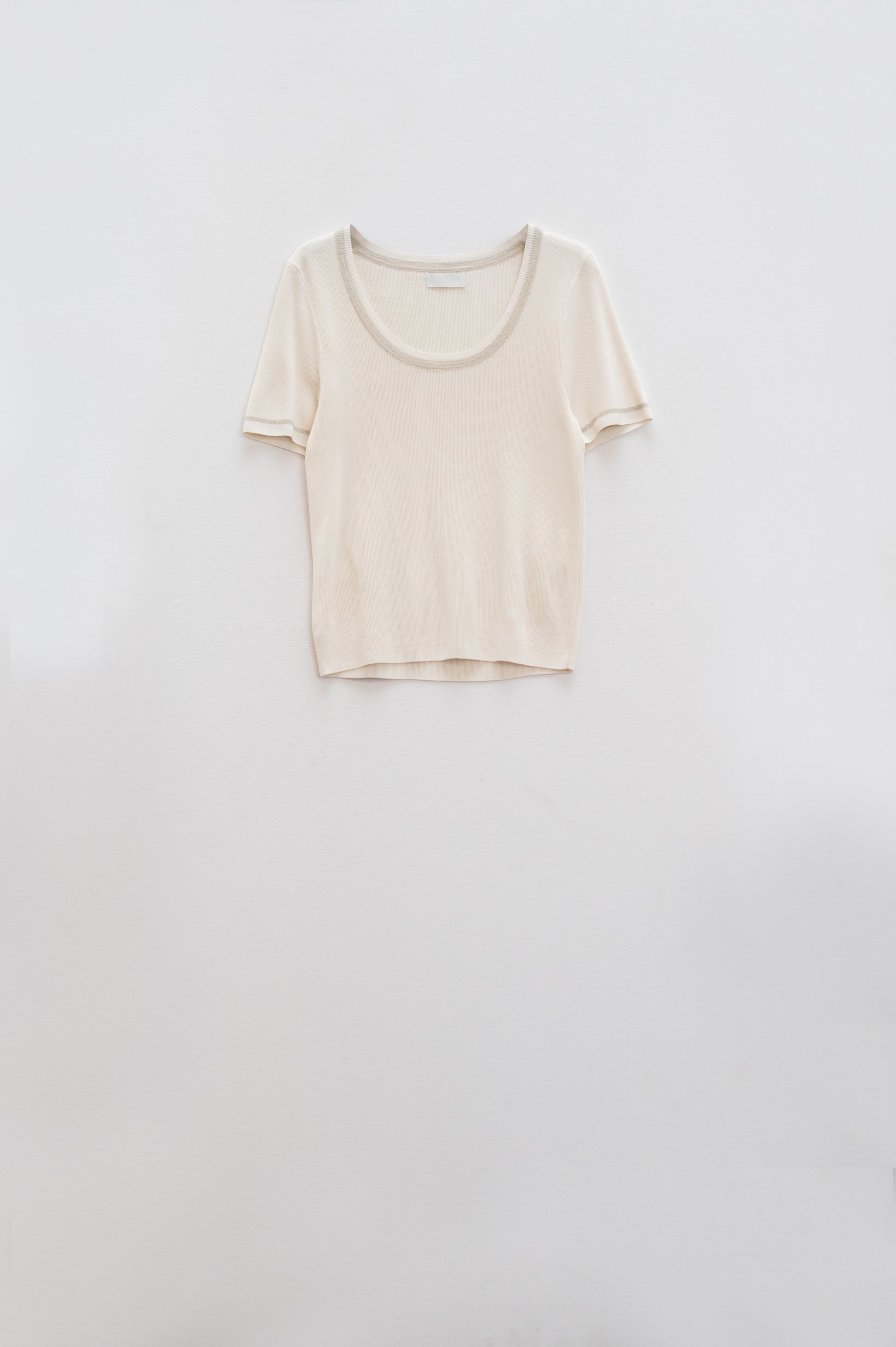 Maglione a manica corta in beige con cuciture argentate sullo scollo rotondo
