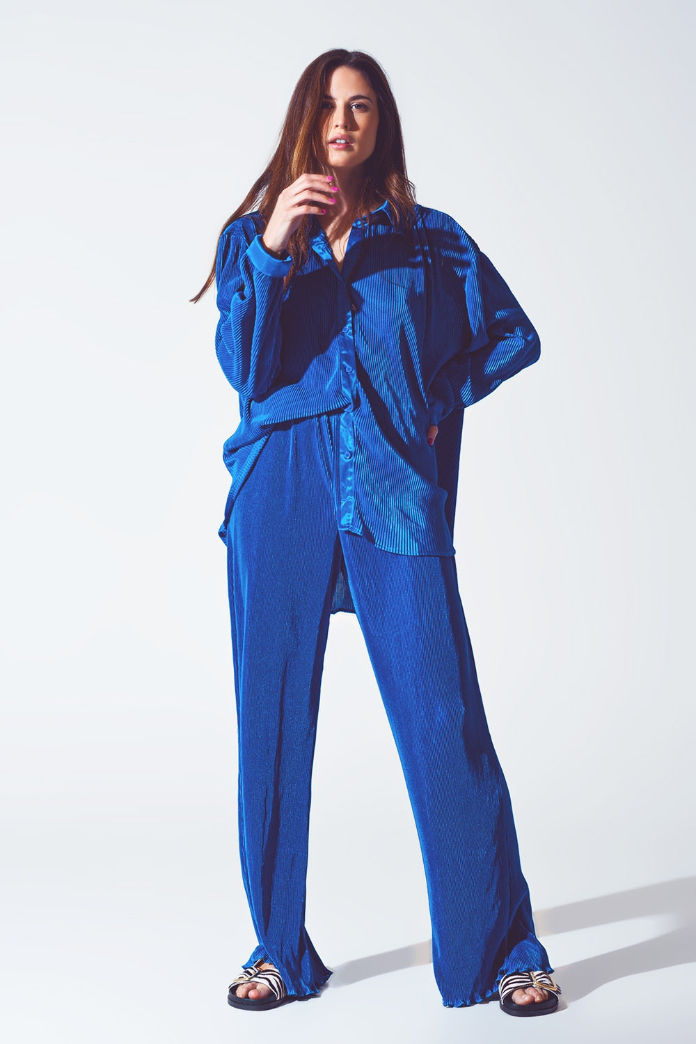 Pantaloni a gamba larga plissettati in raso di colore blu