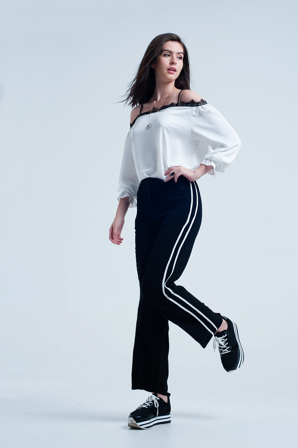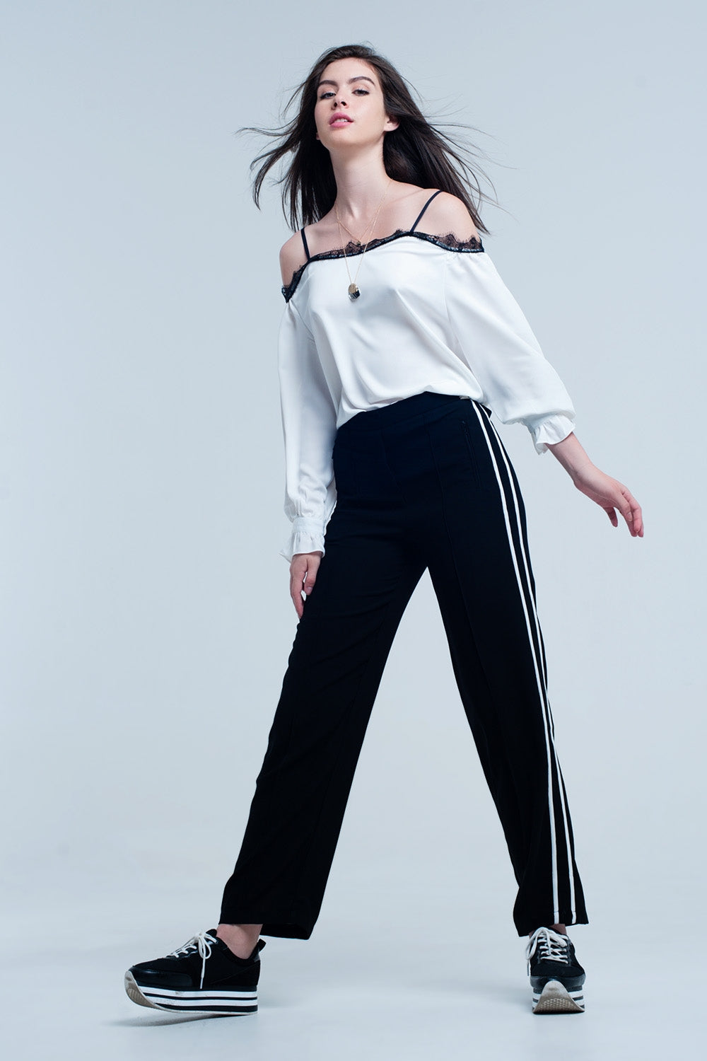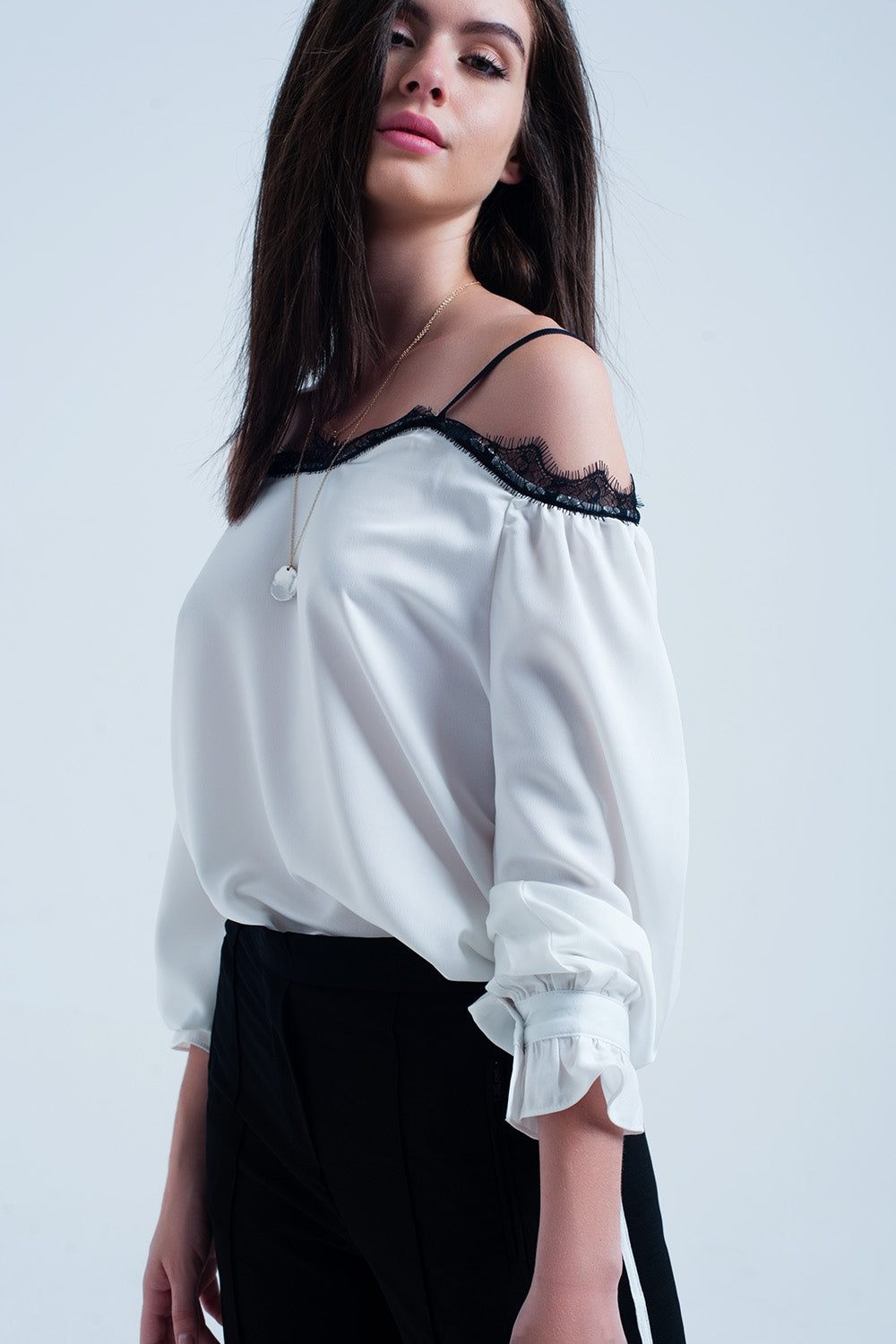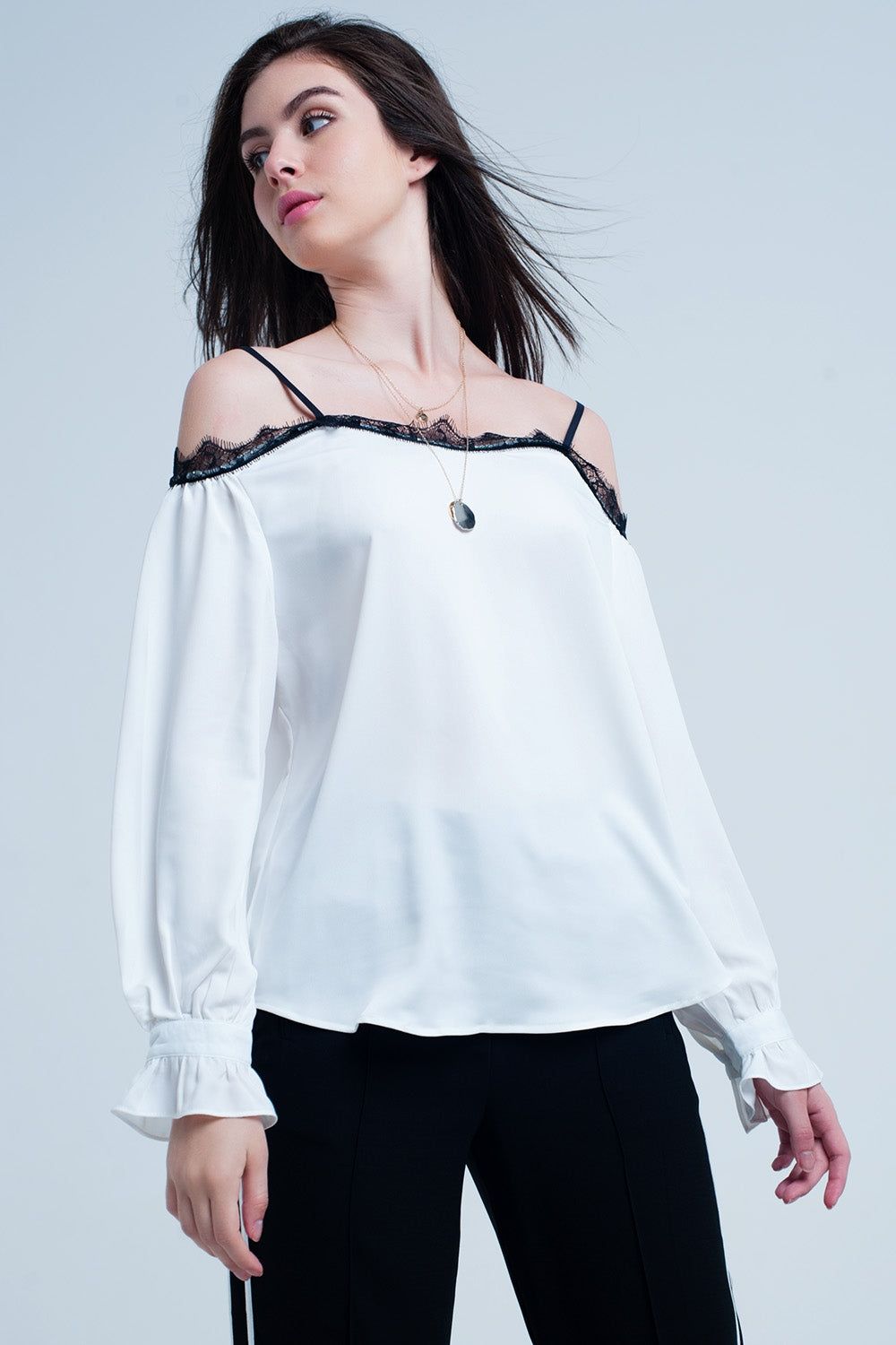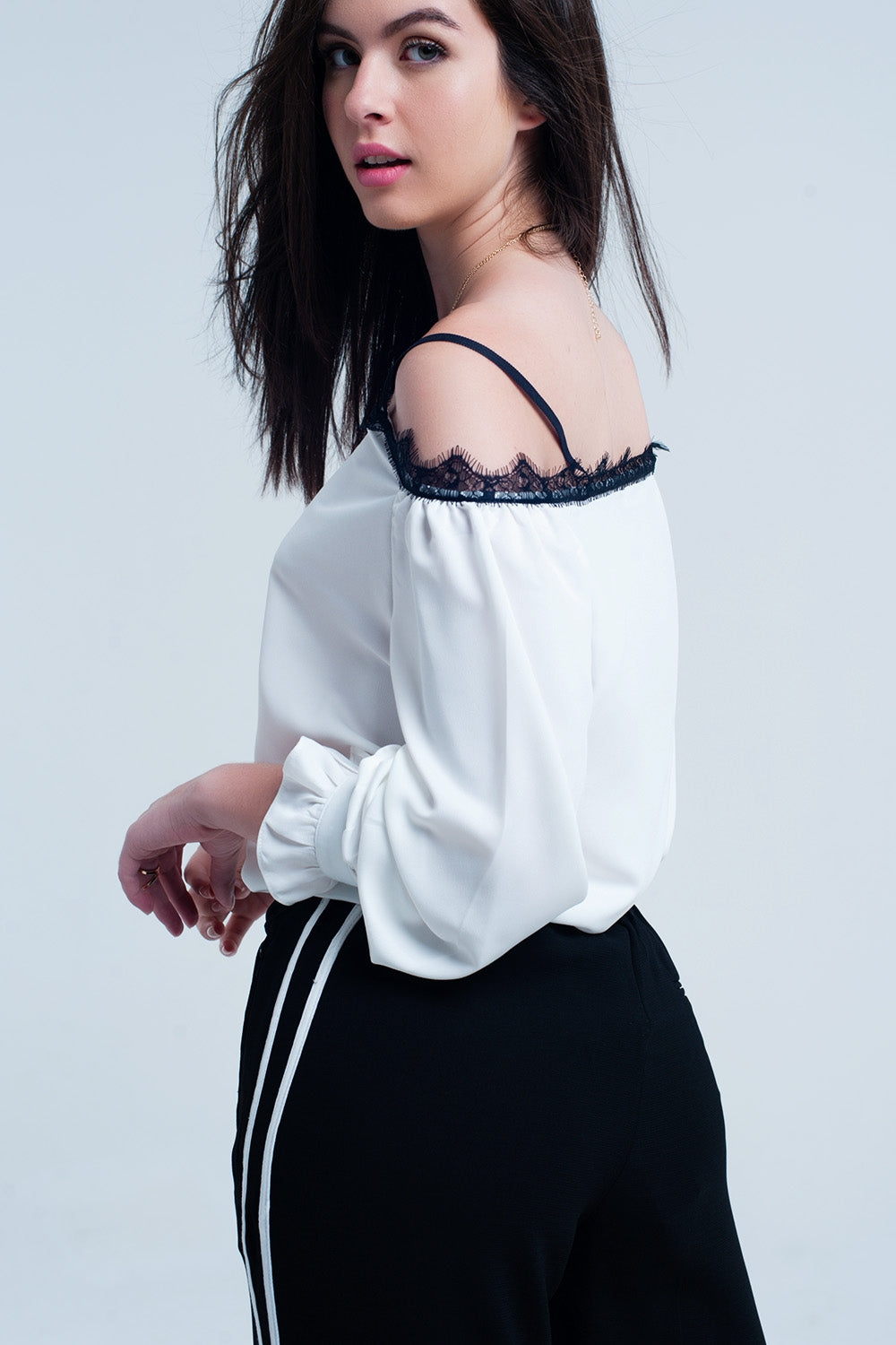 Top con pizzo nero e spalle nude bianco